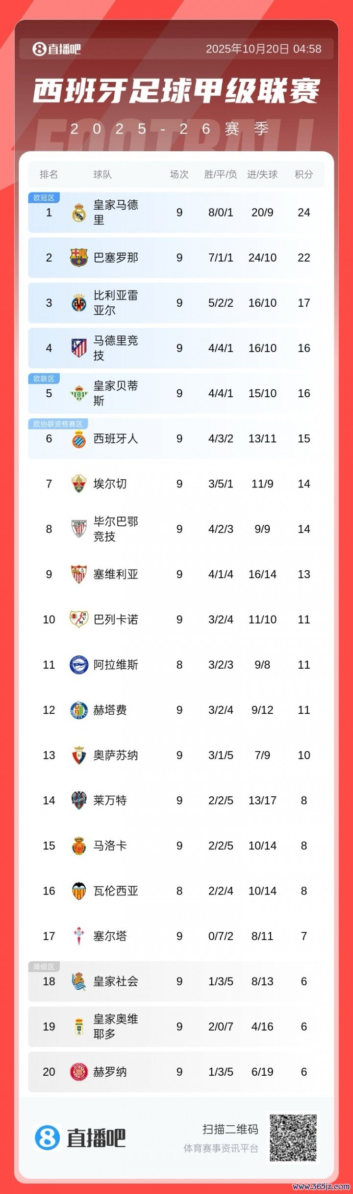 巴萨名递次二,比利亚雷亚尔第三,马竞第四。西甲第10轮10月26号将迎来国度德比,皇马主场迎战巴塞罗那。