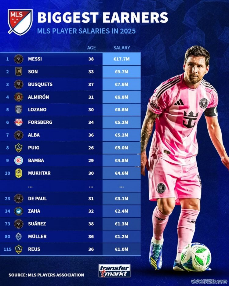 德转列好意思职联薪资:梅西1770万欧断层居首,孙兴慜970万欧次席