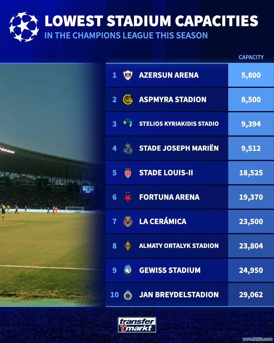 欧冠霸主皇家马德里的主场圣地亚哥·伯纳乌球场以83186东说念主名列榜首,阿塞拜疆球队卡拉巴克的主场可容纳东说念主数则最少仅有5800东说念主。