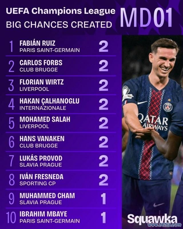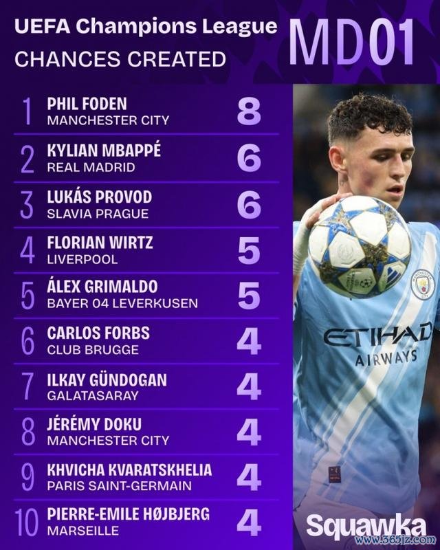 欧冠首轮创造契机榜:福登8次领跑,姆巴佩6次、维尔茨5次