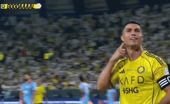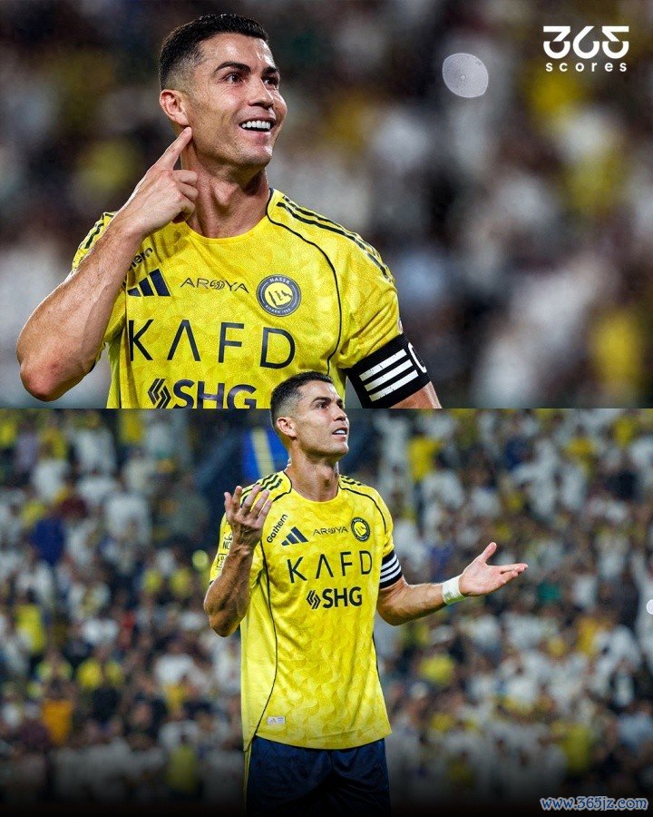 比赛中,利雅多礼育球迷高喊梅西的名字,C罗在进球后笑入部属手指耳朵摇头,并摊了一下手。
