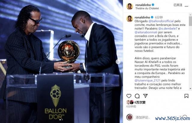 罗纳尔迪尼奥社媒晒出受奖像片,并写谈:“感谢金球奖的邀请,今晚留住了好多好意思好的回忆!恭喜登贝莱和邦马蒂荣获金球奖,也祝颂通盘获奖和入围的球员们……你们是足球的刻下和改日。”