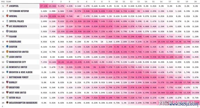 因此,在5轮畛域后,英超伙同伙伴OPTA也作了一个分析,列举了20支英超最终名次的表格。大众最存眷的冠军争夺,利物浦夺冠契机达到57%,伊始了五成,随后是阿森纳的26%,刚好大于四分之一。接下来的齐莫得达到10%,伊始1%的球队,按照上下规章辩别为曼城、切尔西、水晶宫、纽卡斯尔、伯恩茅斯和热刺。