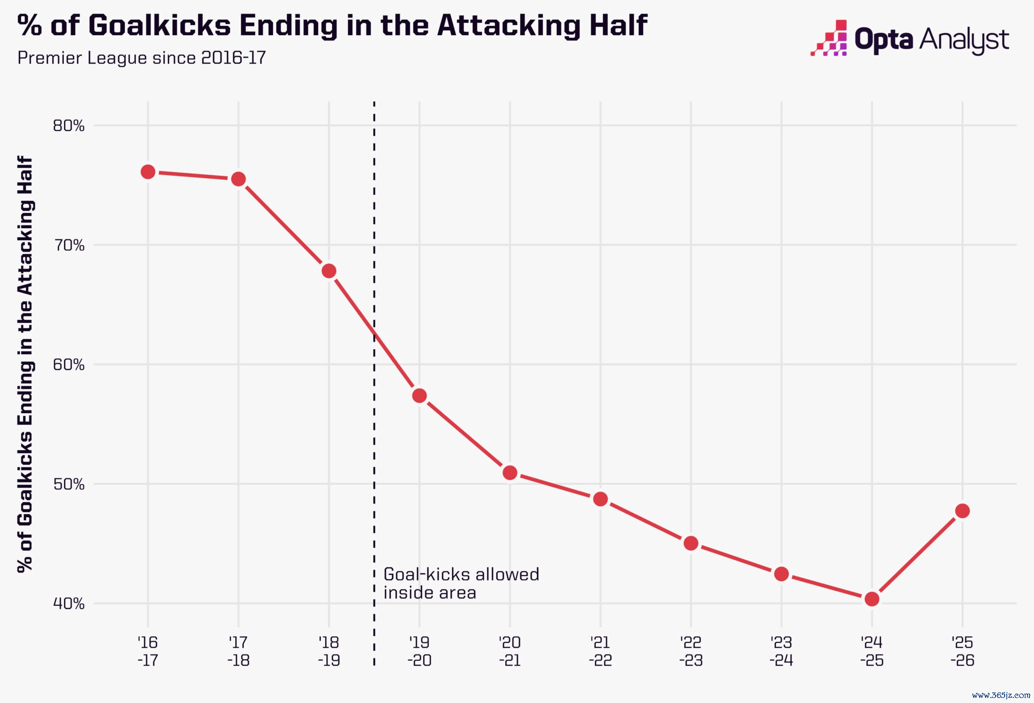 本赛季英超门将大脚开球比例达48.4%, 近十年该数据初度回升