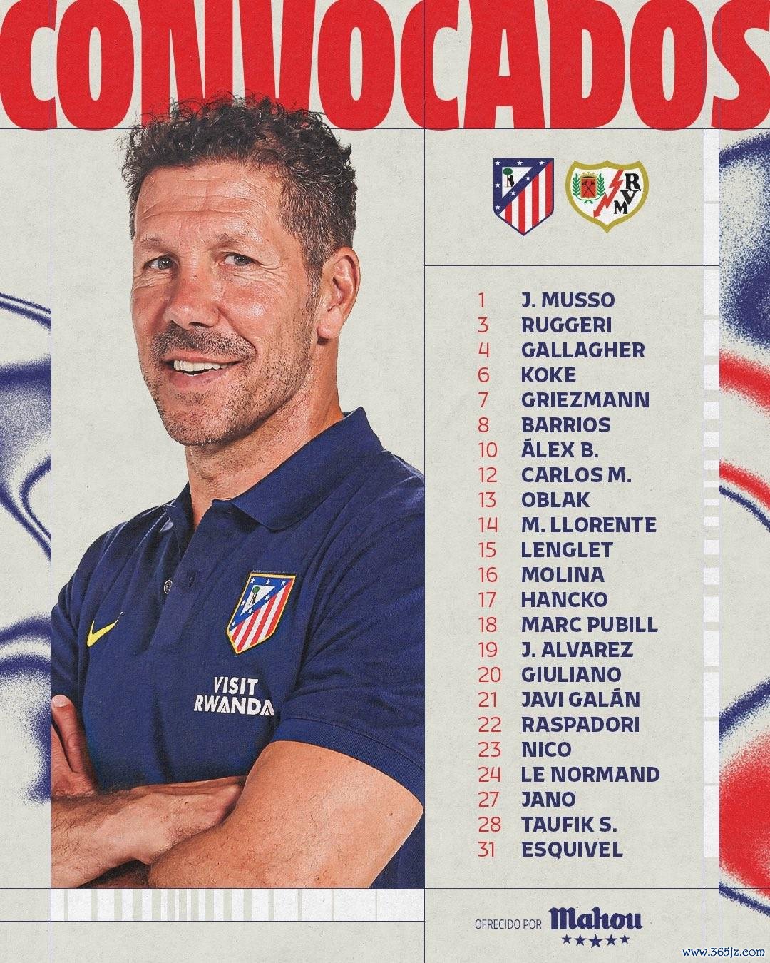 马竞主场战巴列卡诺大名单如下: