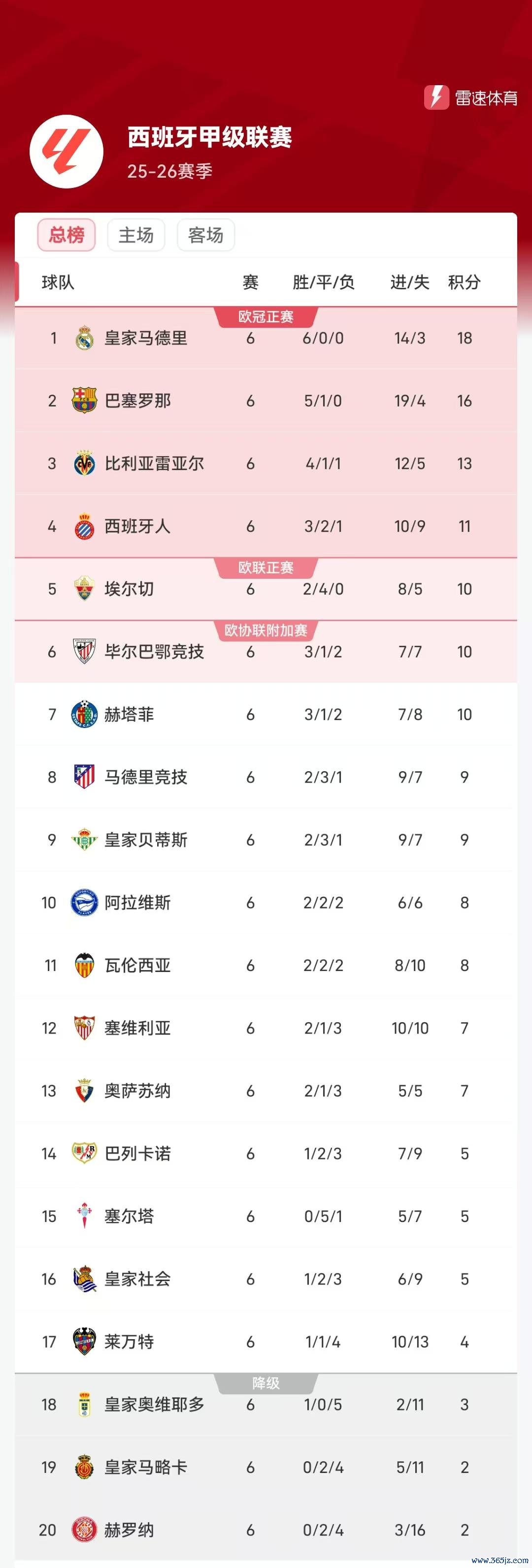 雷速体育9月26日讯 西甲联赛第6轮沿途战罢,最新积分榜火热出炉,皇马仍旧名次榜首。