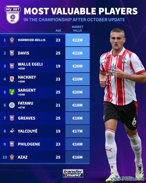 英冠最新身价前十:贝利斯、戴维斯2200万欧居首,伊镇4东说念主在列