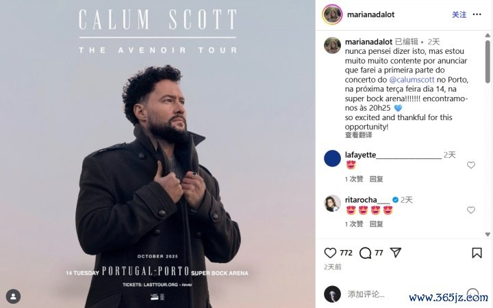 玛丽安娜-达洛特在卤莽媒体上写谈:“我从未念念过我方会说出这句话,但我相配得意地文书,我将鄙人周二,10月14日,于波尔图的超等波克竞技场为卡尔姆-斯科特(Calum Scott)的演唱会担任开场嘉宾!咱们晚上8点25分见,我对此契机感到无比欢叫和谢意。”