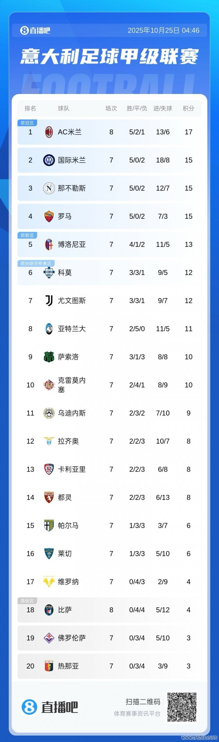 爆冷平垫底队!米兰丢分仅剩2分上风,234名均积15分王人有登顶契机