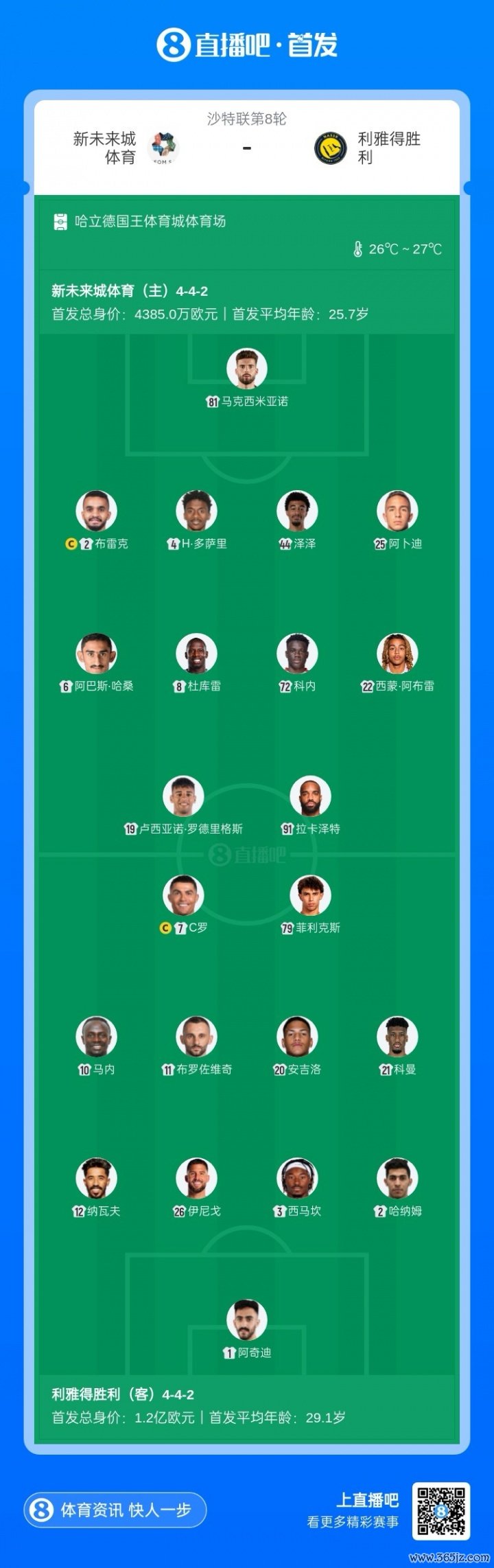 利雅得得手首发:1-阿奇迪、2-哈纳姆、3-西马坎、26-伊尼戈·马丁内斯、12-纳瓦夫、11-布罗佐维奇、20-安吉洛、79-菲利克斯、21-科曼、10-马内、7-C罗