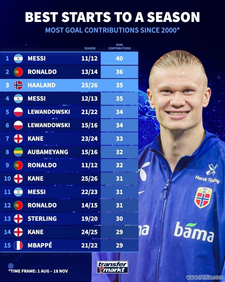 11月20日讯 德转统计了本世纪赛季开局的进球孝敬数,哈兰德以35粒进球位居历史第三,仅次于梅西和C罗。