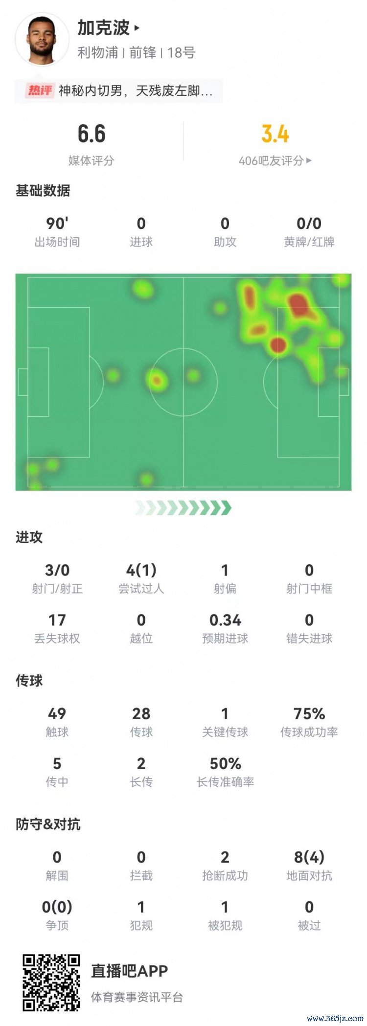 11月23日讯 利物浦在本轮英超主场0-3惨败诺丁汉丛林,加克波本场数据如下: