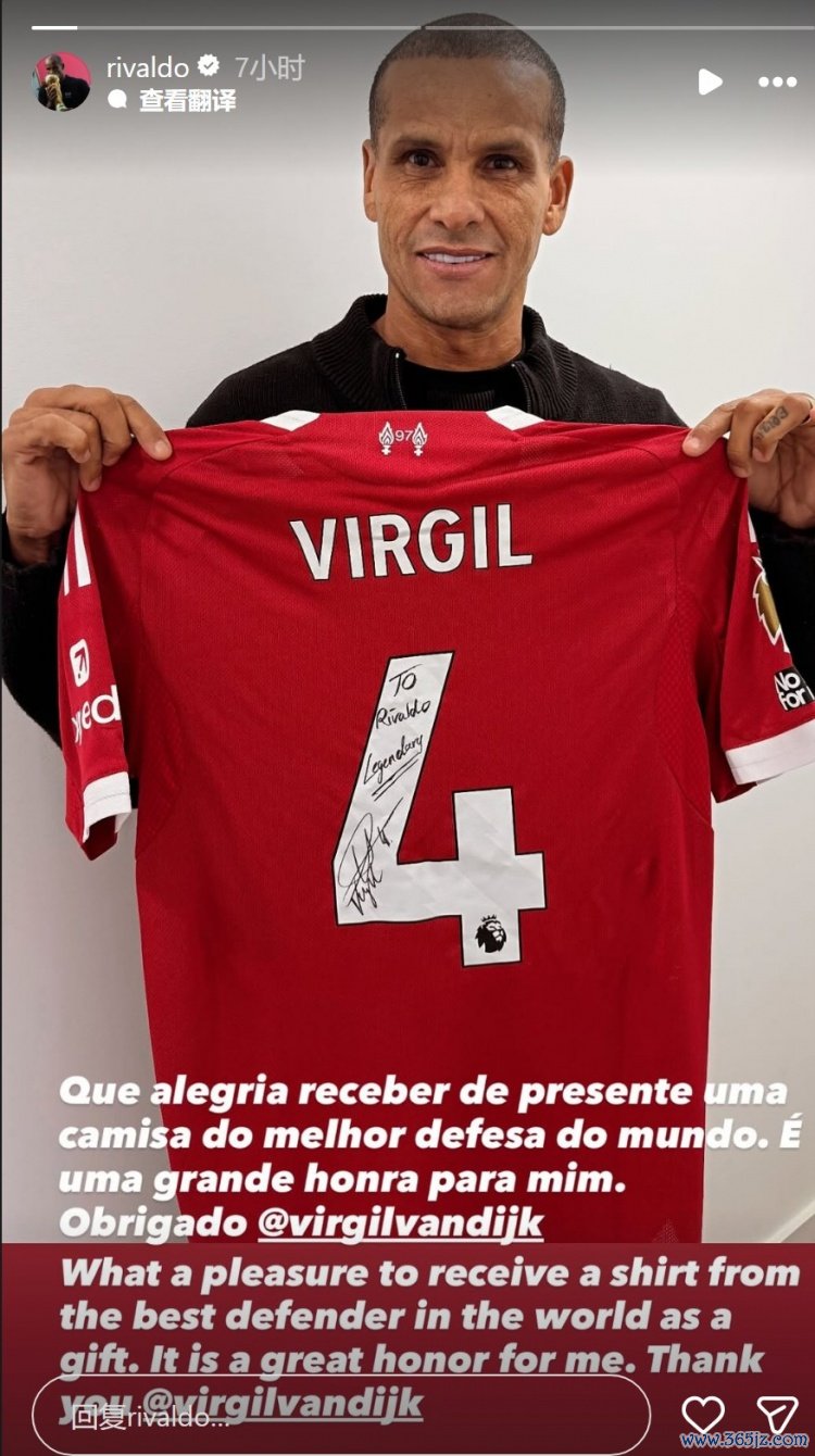 里瓦尔多社媒晒发轫拿范戴克球衣的像片,配文:“能收到全国最好后卫营救的球衣,简直太棒了!”