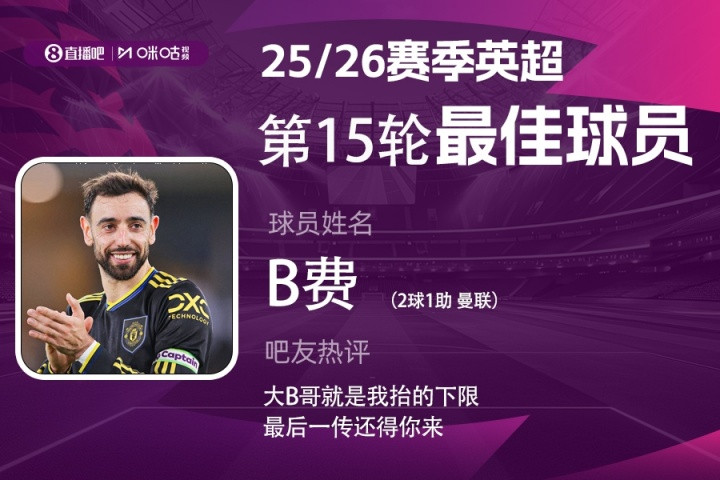 2025-2026赛季英超火热进行中,直播吧和咪咕体育集中发起每轮英超最好球员评比步履!第15轮评比效果依然出炉,曼联队长B费当选!