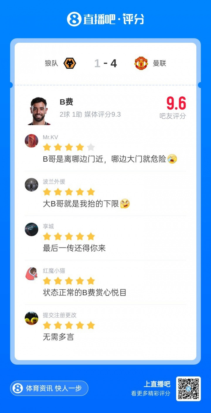 在曼联4-1客胜狼队的比赛中,B费2球1助,教养曼联升上英超第6位,告捷当选[直播吧X咪咕体育英超第15轮最好球员]!