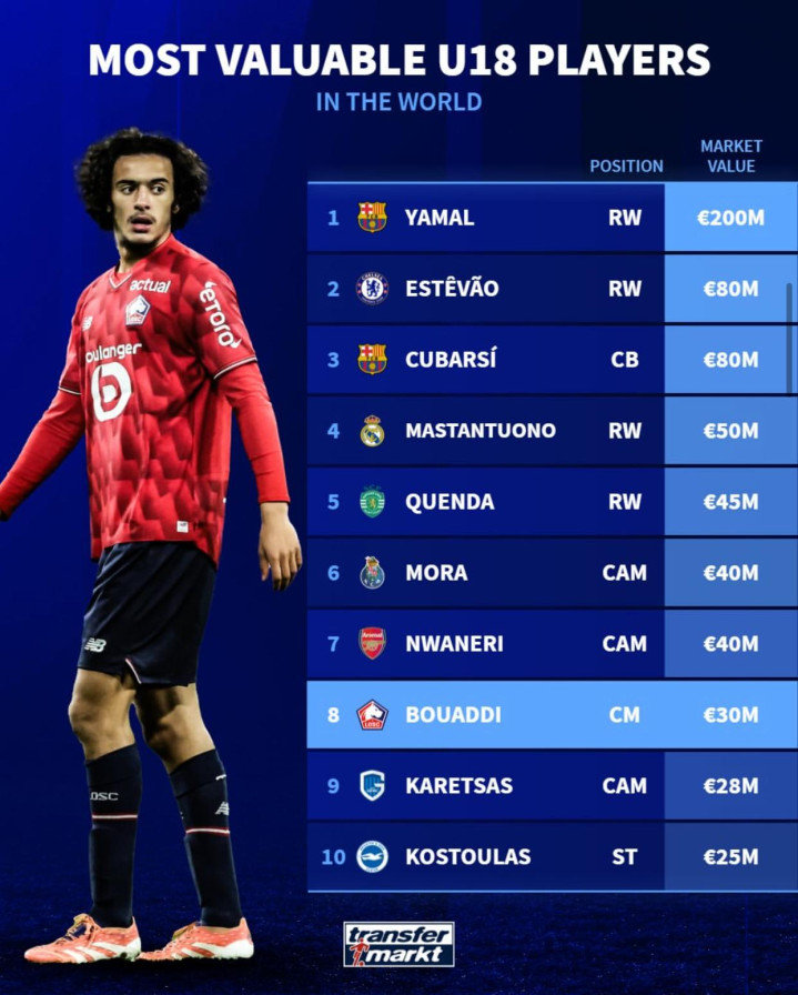 中超进球数 U18球员身价Top10: 亚马尔、埃斯特旺、库巴西位列前三