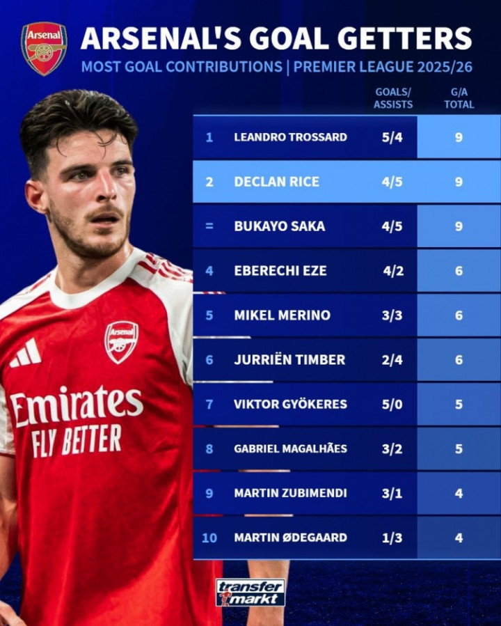 9球:特罗萨德(5球4助攻)、赖斯(4球5助攻)、萨卡(4球5助攻)