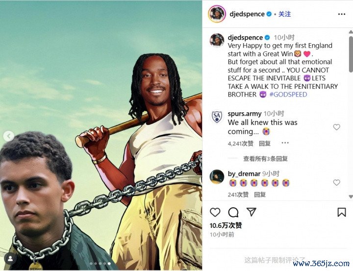 斯宾塞在社媒中连发多张赛场照,其中还附带了一张我方与约翰逊的梗图。