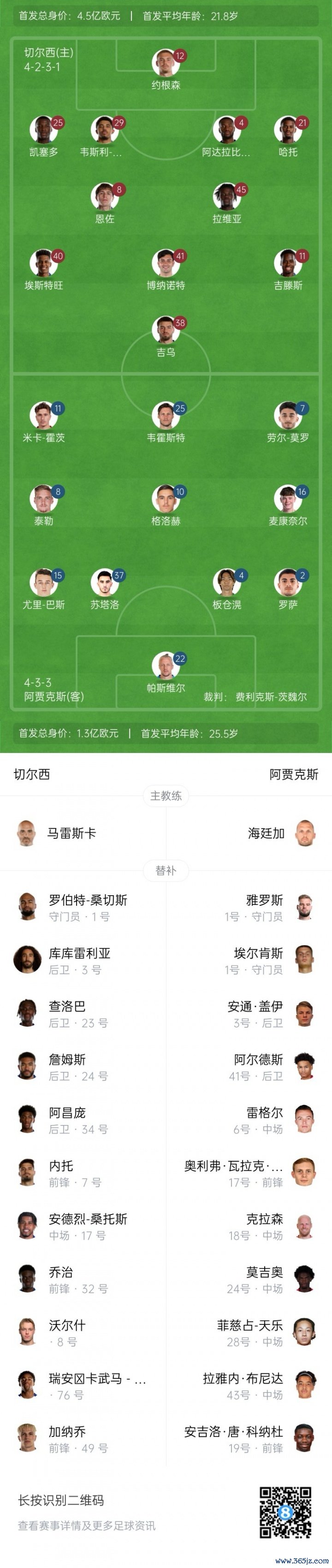 瓜代!切尔西vs阿贾克斯首发:吉乌、吉腾斯、埃斯特旺出战