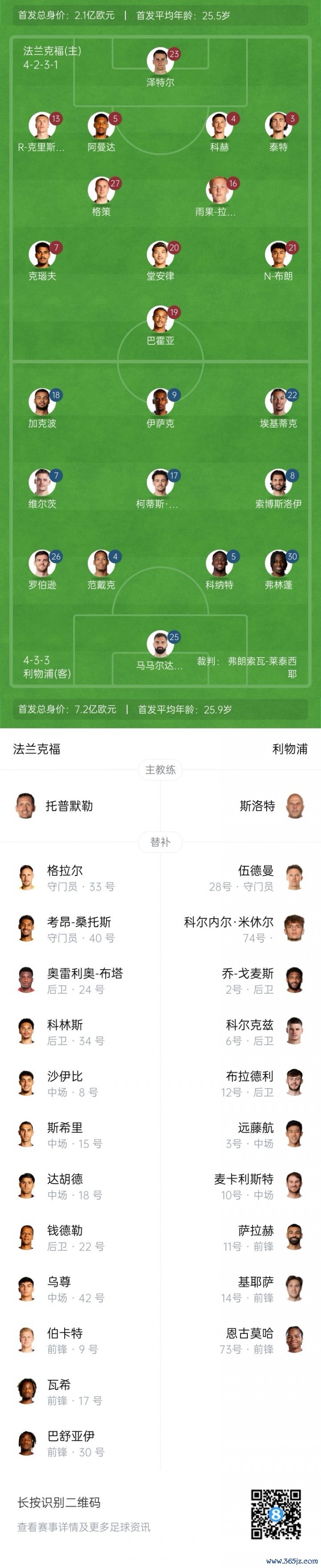 利物浦欧冠1胜1负积3分,联赛5胜3负积15分暂位英超第4,近期遭受各项赛事4连败;法兰克福欧冠相同1胜1负积3分,联赛3胜1平3负积10分暂位德甲第7,各项赛事流畅3场不堪。
