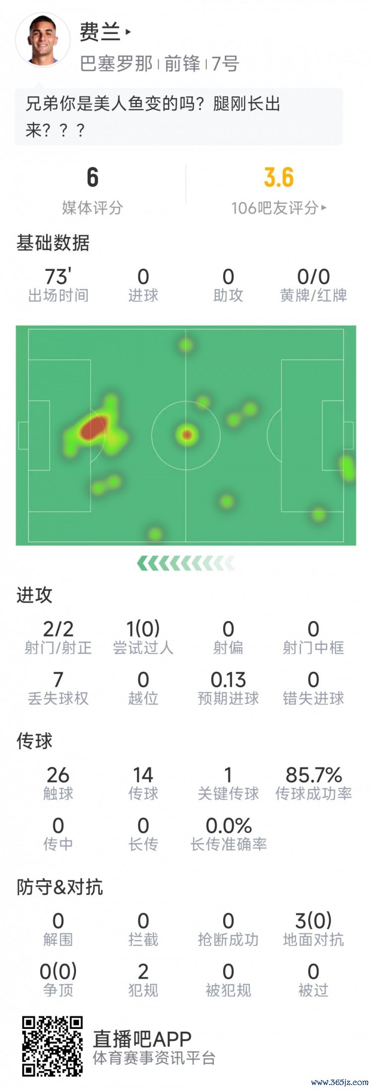 费兰本场数据:2次射门均射正,1次关节传球,3次抵抗0告捷
