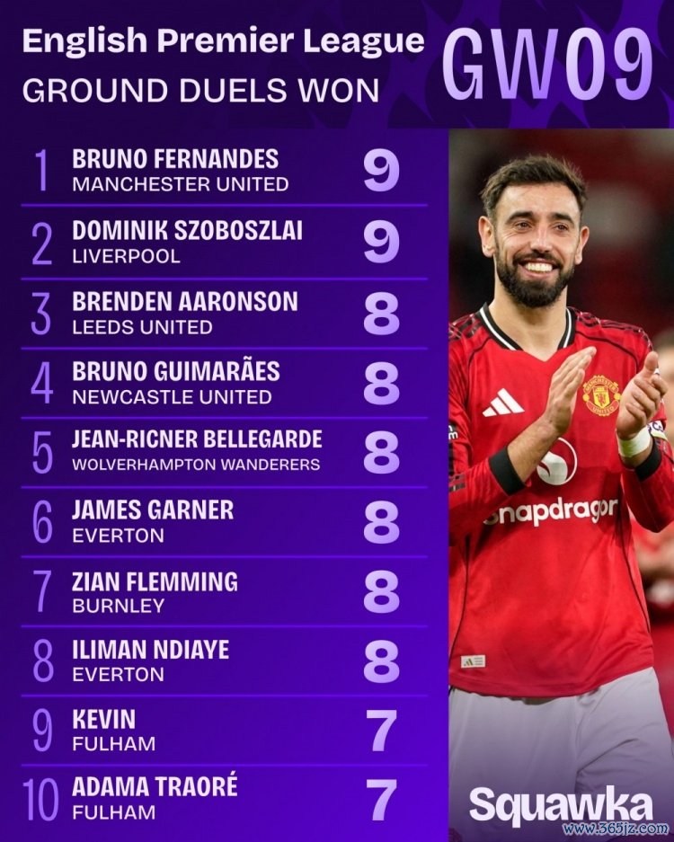 10月28日讯 英超联赛第9轮也曾完赛,数据机构squawka统计了本轮大地挣扎告捷次数,曼联队长B费和利物浦中场索博斯洛伊比肩居首。