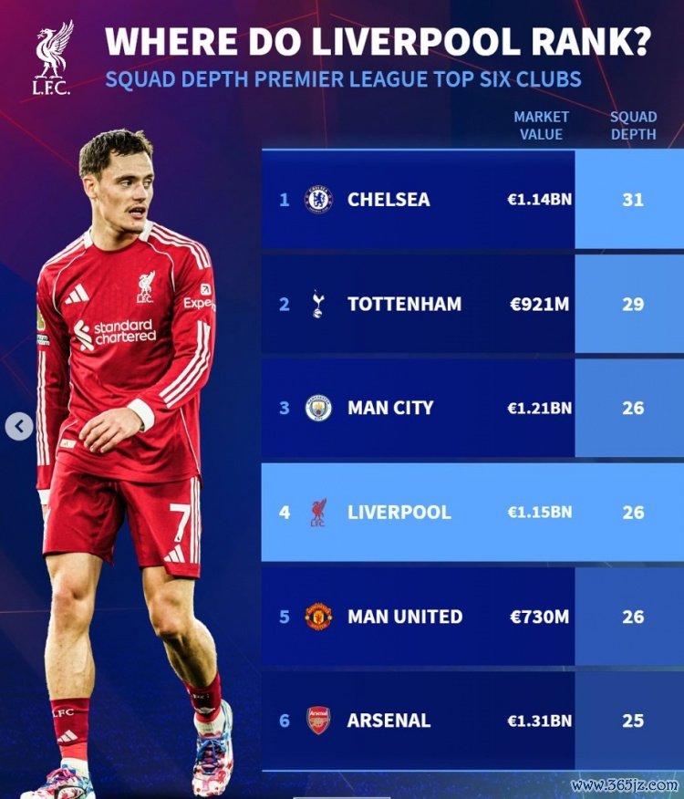 斯洛特称东说念主手不及?德转列BIG6威望深度:利物浦26东说念主并排第三