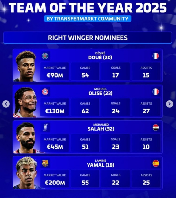 直播吧12月5日讯《转会商场》评比2025年最好右边锋,比肩出了4东谈主候选同期对比了他们的数据: