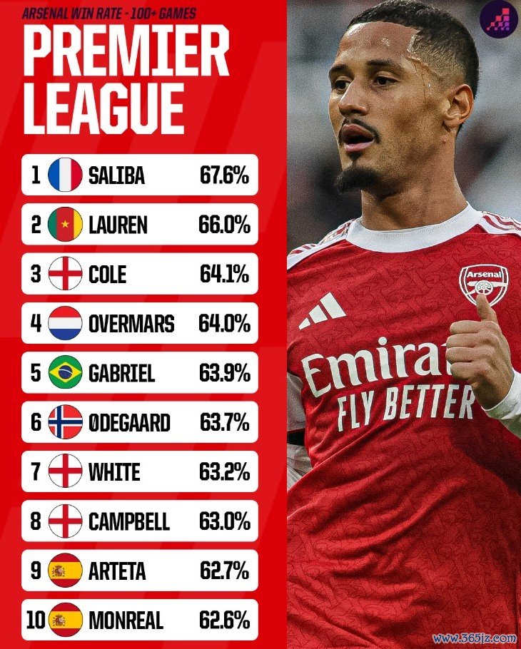 9月30日讯 萨利巴与阿森纳续约在即,OPTA也清点了阿森纳队史球员在英超胜率榜(至少100次出场),其中萨利巴居首,具体如下: