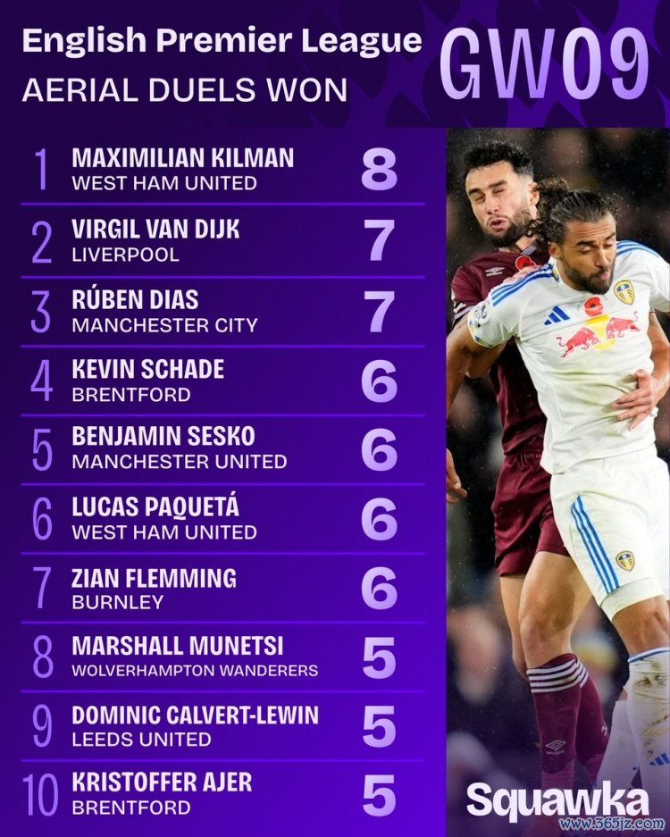 英超第9轮获得空中抗拒次数榜:基尔曼8次最多,范戴克等两东说念主7次