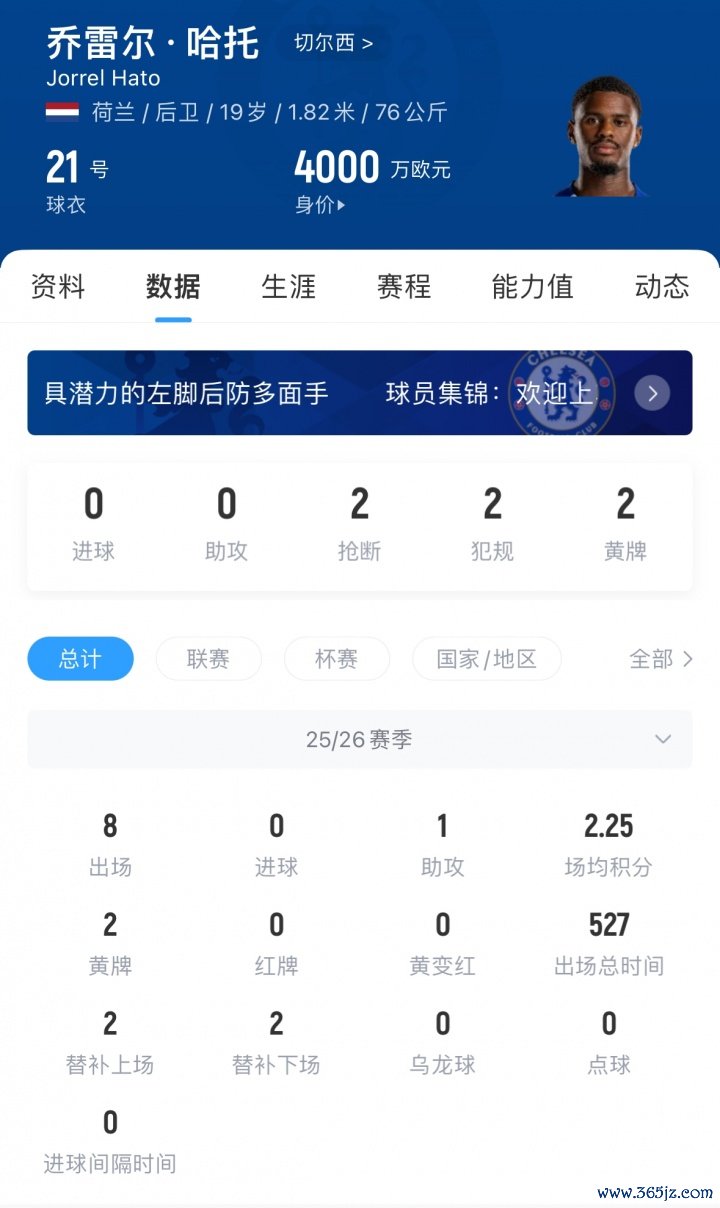 11月06日讯 欧冠联赛阶段第4轮,切尔西2-2战平阿塞拜疆球队卡拉巴赫,本场比赛,切尔西小将哈托发达灾祸,极端耸立+送点,导致敌手相连打入两球。