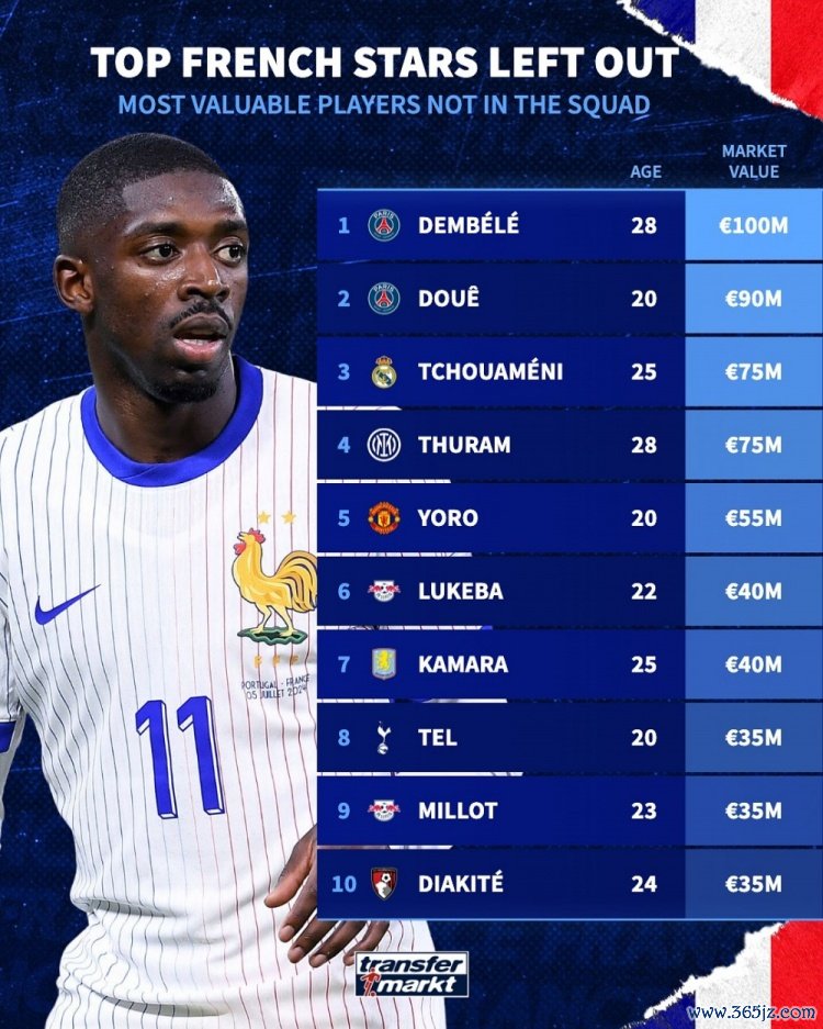 11月14日讯 德国转会商场统计了无缘本期法国队名单球员的身价,并排出榜单,登贝莱1亿欧居首。