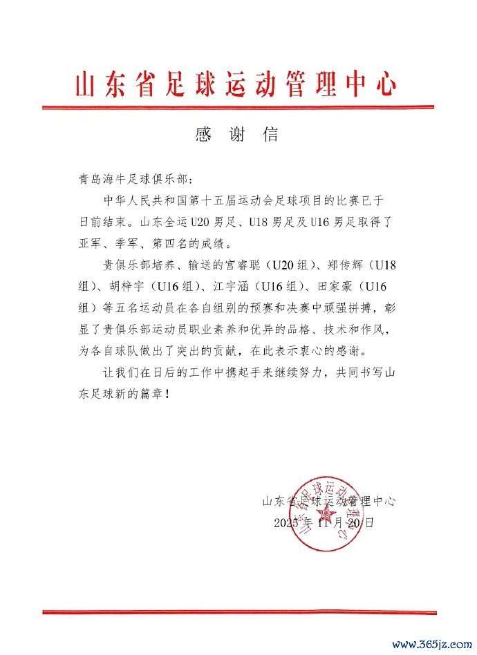 近日,山东省足球畅通处置中心向青岛海牛足球俱乐部发来感谢信,俱乐部培养、运输的5名球员宫睿聪、郑传辉、胡梓宇、江宇涵、田家豪在中华东说念主民共和国第十五届畅通会足球名目中为山东男足作念出了凸起孝敬。