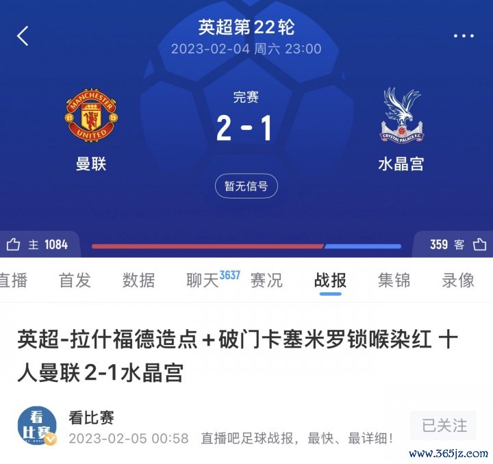 曼联上一次在联赛慑服水晶宫的比赛是2023年2月,尔后4场对阵水晶宫1平3负。