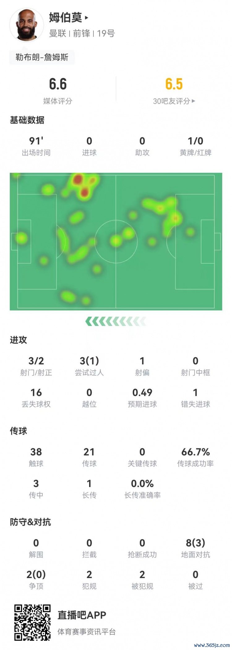 11月30日讯 曼联在本轮英超对阵水晶宫,姆伯莫本场数据如下: